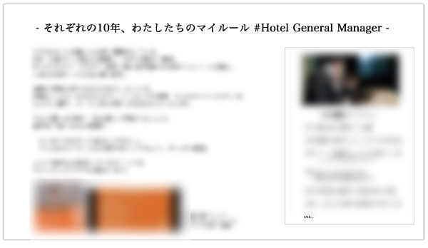開業当初からホテルを知る総支配人を主役に、ホテルで働く人として大切にすること、想い、街のことなどを、「10のマイルール」という切り口で企画提案。